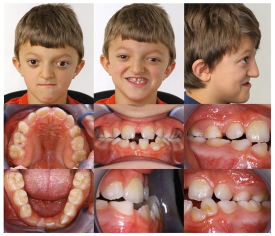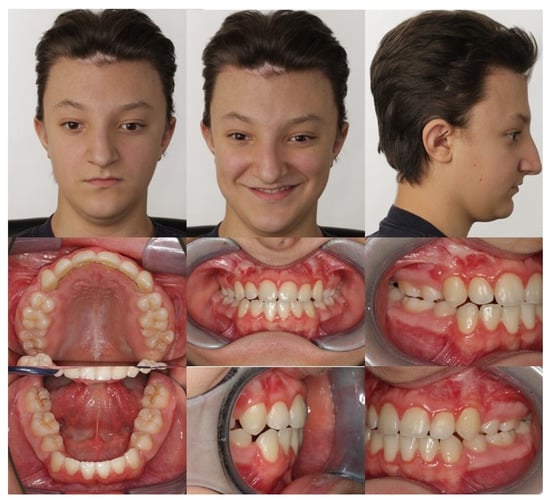 A reliable and valid method for measuring oral health-related quality of life is the COHIP-19 (19-item version of the Child Oral Health Impact Profile) questionnaire. This questionnaire allows for conclusions to be drawn about oral health, functional and social–emotional well-being, school environment, and the patient’s self-image [24]. By answering 19 questions, a score between 0 (worst oral health-related quality of life) and 76 (best oral health-related quality of life) is determined. Before any treatment, the patient’s COHIP-19 score was 55. Compared with children and adolescents of similar age undergoing orthodontic treatment (COHIP-19, 63.2 points), his quality of life appeared reduced [25].