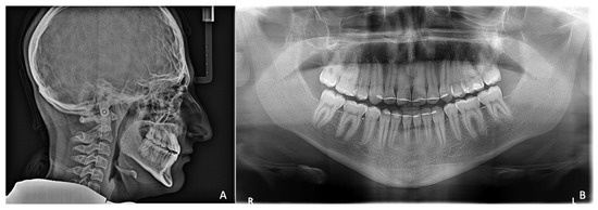 Posttreatment radiographs at the age of 15. (A). Lateral cephalogram at the end of the orthodontic retention period showing a slight relapse of the skeletal relationship. (B). Orthopantomogram showing the stable result with aligned canines.
