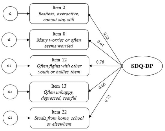 As a preliminary analysis, we ran Confirmatory Factor Analysis (CFA) separately for males and females. Since males and females showed similar factor loadings (all factor loadings ≥ 0.50), and the goodness-of-fit indices were excellent for both groups, we decided to run a CFA for the whole sample. The CFA was performed in IBM SPSS Amos, Version 26.0, using the maximum likelihood estimator. We assessed the model’s goodness-of-fit using different indices, including a chi-square (χ2) statistic, a comparative fit index (CFI), a Tucker–Lewis index (TLI), and a root mean square error of approximation (RMSEA). We interpreted TLI and CFI values ≥ 0.90 as acceptable and ≥0.95 as excellent, and RMSEA values ≤ 0.08 as acceptable and ≤0.06 as excellent [26]. We tested a single-factor model for the SDQ-DP.