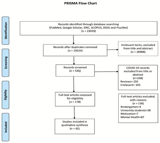 A recommended reference framework for systematic reviews was performed, following the PRISMA guidelines for systematic reviews. The research was conducted in the following databases: PubMed, Google Scholar, ERIC, SCOPUS, DOAJ, and PsycNet, up to 18 July 2021. The algorithm used was the following: (COVID-19 OR SARS-CoV-19 OR SARS-CoV-2 OR “2019-nCoV” OR “novel coronavirus”) AND (“school performance” OR “academic performance” OR learning OR e-learning OR “distance learning” OR “school closure” OR e-classes OR “school grades” OR “academic grades” OR “school notes” OR “academic notes” OR “school attainment” OR “academic attainment” OR “educational attainment”) AND (child OR children OR kid OR kids OR youngster OR youngsters OR adolescent OR adolescents OR teen OR teens OR teenager OR teenagers). References of eligible studies and relevant reviews were searched using a snowballing technique.