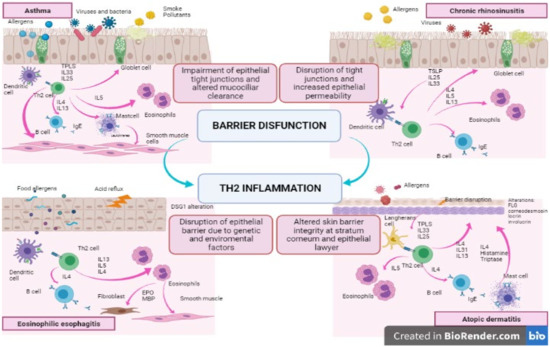 This review focuses on epithelial barrier dysfunction and type 2 inflammatory response in asthma, allergic rhinitis, chronic rhinosinusitis, atopic dermatitis, and eosinophilic esophagitis. A comprehensive search was conducted using the electronic databases MEDLINE via PubMed, Embase databases, and Web of Science. The keywords used were: asthma, allergic rhinitis, chronic rhinosinusitis, atopic dermatitis, eosinophilic esophagitis, epithelial barrier dysfunction, type 2 inflammatory diseases, and children.