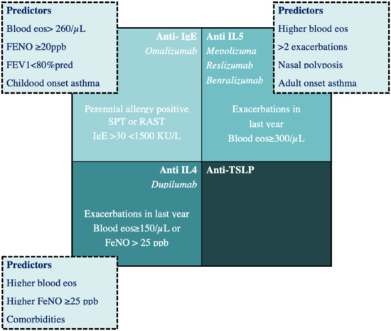 Figure 2. Biologics approved for the treatment of severe asthma: mechanisms, patient selection criteria, and predictors of good responses.