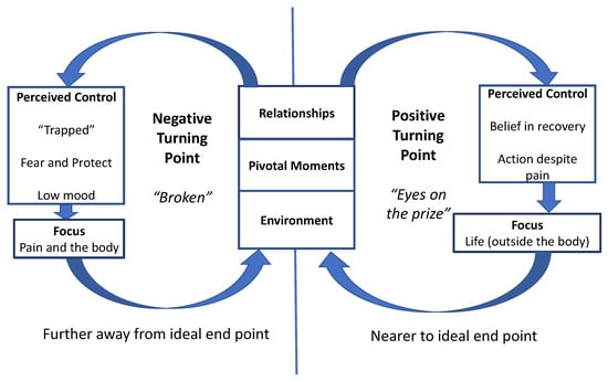 A positive “turning point” took participants closer to recovery, as described in the final theme “free”, whereas a negative turning point took them back to the “perfect storm”. It was during treatment when the outcome domain of emotional functioning became important. Belief in their own recovery was key, yet participants only believed they could recover when they perceived they were in control of their situation and made the required behavioural changes that focused on life (positive turning point). Conversely, when participants described a negative turning point, their perceived control was lost, they lost belief in recovery and protected themselves: their pain and their body became the focus. The change in perceived control was reflected in the language used by participants, changing between “pain stopped me” and “I couldn’t” versus “I want to”, “I can”, and “I’m not going to let it stop me”.