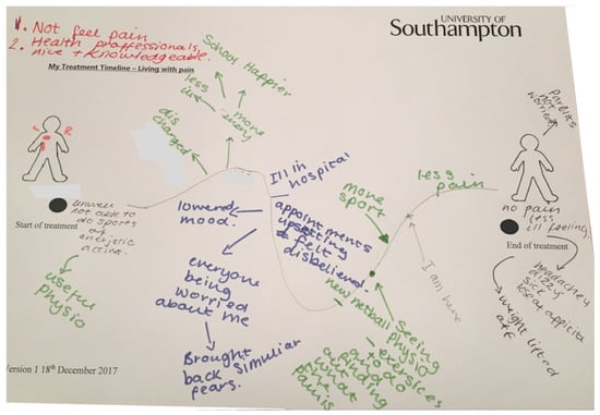 Initial codes represented important data surrounding the topic of outcomes, such as “pain”, “sleep”, “getting a diagnosis”, and “mood”. The interview transcripts were then analysed and any new initial codes were added. This initial coding was applied to the first timeline and transcript by R.J. and L.R., together, to ensure the data could be captured. Following this, R.J. coded the timelines and transcripts continuing the same method. New initial codes were discussed with M.D.-H. and L.R. The initial codes were then collected onto a single timeline to enable the researchers to identify which initial codes held relevance through the treatment journey and which only held relevance at specific points. Separate drawings were then made for different initial codes, and the researchers explored how the initial codes and the language used to describe them changed over the treatment journey. For example, for the initial code, ‘pain’ language changed from “uncontrollable pain” at the start, to pain “spread” during treatment and “pain free” at the end of treatment.