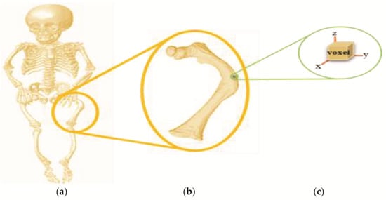 Determination of a voxel: (a) processing of all DICOM® files; (b) selection of the tomographic slices corresponding to the femur; (c) delimitation of the minimum unit of a tomography.