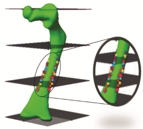 The 3D modeling of bone tissue, in conjunction with the finite element method, has become a valuable tool in the orthopedic area since it helps to: determine the structural composition of the bone, predict the behavior of the bone subjected to various external agents, and design and optimize surgical implants [,,]. Bone fractures can be simulated using tomography studies imported to software that computes the finite element method FEA, and they can differ from each other depending on the methodology used to carry out bone characterization and analysis []. The mineral density (BMD), in conjunction with finite element models, shows the possible fracture indifferent bone structures [,,]. From another perspective, flexion and torsion tests were performed on critical areas subject to bone fracture OI [,,]. Moreover, a numerical fracture report has been documented in 3D bone models, and various stress analyses on these models have been performed [,]. Additionally, other authors have performed numerical simulations to determine the behavior of the femur affected with OI considering particular case studies [,,,,,].