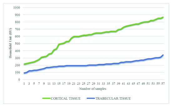 Figure 4 shows the graph of HU values obtained randomly for the cortical and trabecular tissue in each of the analyzed sections. Thus, the minimum value of −96 HU was determined in the trabecular tissue, and the maximum value was 962 HU for the cortical tissue. Thus, the relationship between apparent density and HU was finally established by Equation (1).
