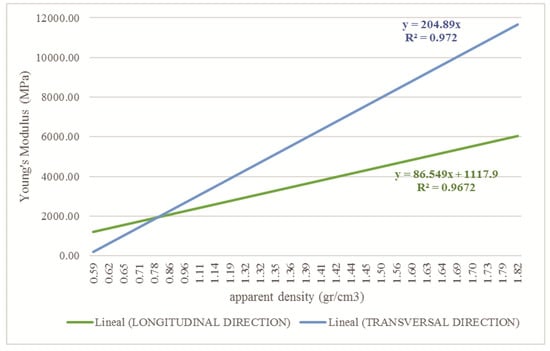 The bone elastic modulus is defined transversely or longitudinally, according to the direction in which a force is applied. According to Wirtz [], the necessary equations are reported to obtain the bone elastic modulus (E) in transversal and longitudinal form by using the bone density for the cortical and trabecular tissue. Moreover, the equations that define the Poisson’s coefficient (ρ) and the bone’s shear modulus (G) are reported. The OI bone’s biomechanical properties were computed using the apparent density values shown in Figure 3 and the Wirtz equations. Figure 5 shows the corresponding values to the relationship between the apparent density of the cortical tissue and Young’s Modulus in the longitudinal and transverse direction of the femur. The relationship shown in Figure 6 concerns trabecular tissue.
