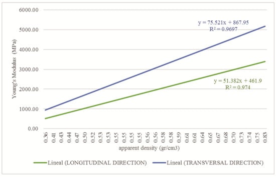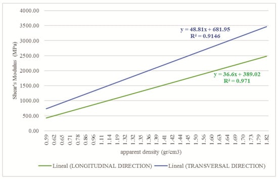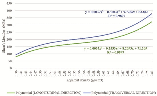 The shear modulus of the cortical and cancellous tissues in the longitudinal and transverse direction was determined by the apparent density, Young’s modulus, and Poisson’s ratio. Figure 8 and Figure 9 show the values of the shear modulus for the apparent density.
