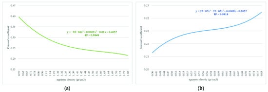 Relationship between apparent density and Poisson’s coefficient for bone tissue affected with OI: (a) cortical tissue; (b) trabecular tissue.