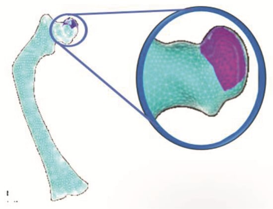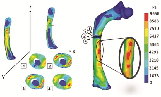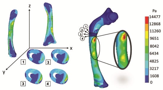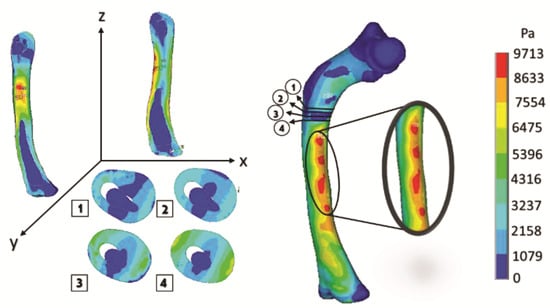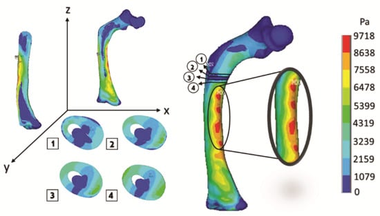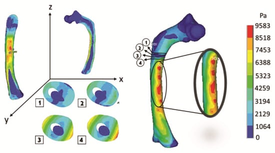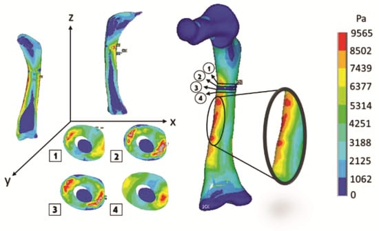 The Pauwels distributed load model was used to perform a femur analysis in the frontal plane, as a hip stabilization system in the monopodial support, a more critical condition in the gait cycle. The force exerted by the abductor’s muscles in this phase will be four times the infant’s weight. Considering a child with an OI weight of around 11 kg, a force equivalent of 431.64 N is obtained. This force was applied to the upper part of the femur head, as shown in Figure 11 (magenta zone) [].