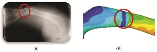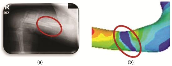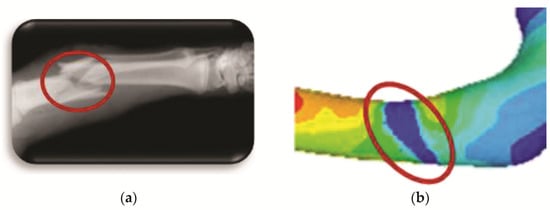 The oblique fracture in a medical image (radiography) and the finite element model fracture are generated, and their appearance after the numerical analysis is shown in Figure 14.