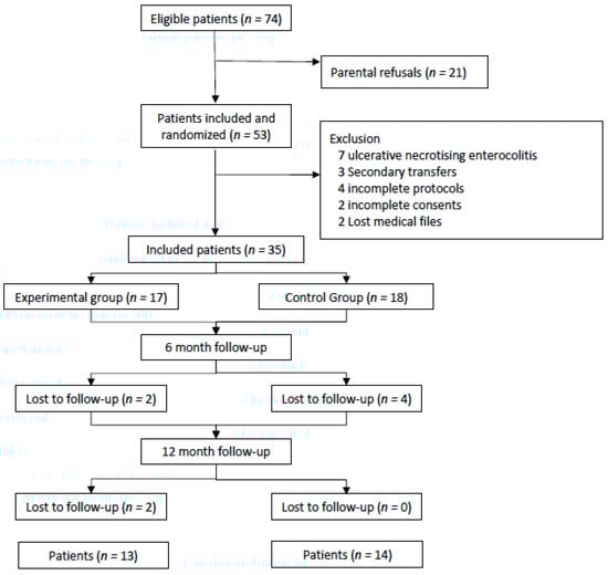 During the 12-month follow-up, eight patients were lost to follow-up: four from the experimental group and four from the control group (Figure 1).