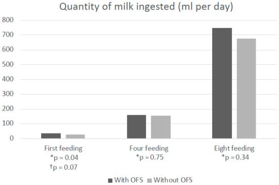 Amount of milk ingested during the 1st, 4th and 8th independent feeding (ml), in the experimental (OFS n = 17) vs. control group (without OFS, n = 18). p: value of the difference between groups with available data; * Value of p in univariate analysis. † Value of p in multivariate analysis including Gestational Age, Birth Weight and total duration of ventilation. p < 0.05: statistically significant difference.