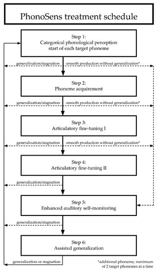 The structure of the PhonoSens treatment allows for an individualized pathway for each child and for each target phoneme. At the end of each step, predefined criteria lead to the next treatment step. Treatment of each target phoneme begins with Step 1 (Figure 1), with subsequent steps being based on the child’s individual progress.
