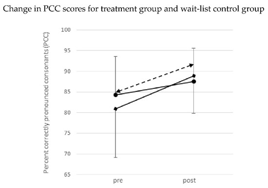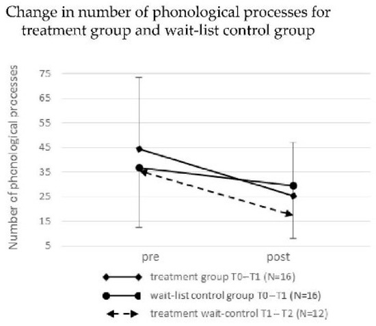 The mean PCC scores and the number of phonological processes found at time point T0 differed numerically between the treatment and the wait-list control group, but not significantly. This difference might impact the comparability of both groups. We, therefore, determined the degree of improvement shown by the children in the wait-list control group during their treatment phase. Both measures of treatment effectiveness were of comparable magnitude to those of the children in the treatment group. This concern about the comparability of both groups seems, therefore, to be unfounded.