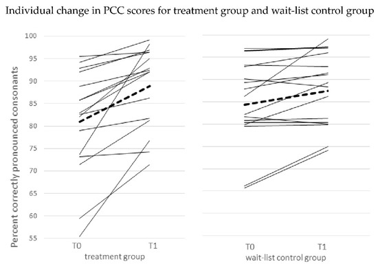 The individual scores for change in PCC values over time from T0 to T1 (Figure 3) show improvements for all 16 children in the treatment group but only for 11 out of 16 children in the wait-list control group.
