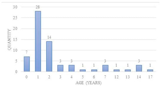 In the analyzed studies, the average age of patients suspected of foreign body aspiration who underwent rigid bronchoscopy was 3 years old, while most of them (52–81%) did not exceed 3 years old [,,,,]. It is believed that the third year of life carries the greatest risk of foreign body aspiration. Our study confirmed this statistical data.