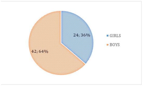 Analyzed children were aged from 8 months to 17 years old; average age was 2.92 years old. Quantity of each age group is presented on the graph below (Figure 1). Among the operated patients, 49 (74.24%) were no older than 3 years of age at the time of the procedure. Most of the children suspected of foreign body aspiration were boys, at 42 cases (63.64%); girls were operated upon in 24 cases (36.36%) (Figure 2).