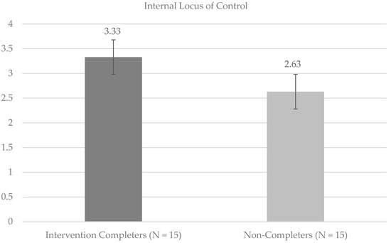Independent samples t-tests were used to compare perceptions of physical appearance and sense of internal HRLOC among Intervention Completers and Non-Completers. Significant differences on the SPPA Physical Appearance (SPPA PA) subscale suggested more negative perceptions of physical appearance at baseline (t(28) = −3.48, p < 0.05) among Intervention Completers compared to Non-Completers (Cohen’s d = 1.31; large effect size). Internal HRLOC (t(28) = 2.15, p < 0.05) was significantly higher among Intervention Completers compared to Non-Completers at baseline (Cohen’s d = 0.81; large effect size). Figure 1 and Figure 2 provide mean values for the SPPA PA and MHLC Internal subscales, respectively. Post hoc Shapiro–Wilk tests of normality were run, and supported the conclusion that the data were normally distributed for the Intervention Completers on the SPPA PA (statistic = 0.97, p = 0.83) and internal HRLOC (statistic = 0.96, p = 0.64) scales, as well as for Non-Completers on the SPPA PA (statistic = 0.89, p = 0.07) and internal HRLOC (statistic = 0.92, p = 0.17) scales.