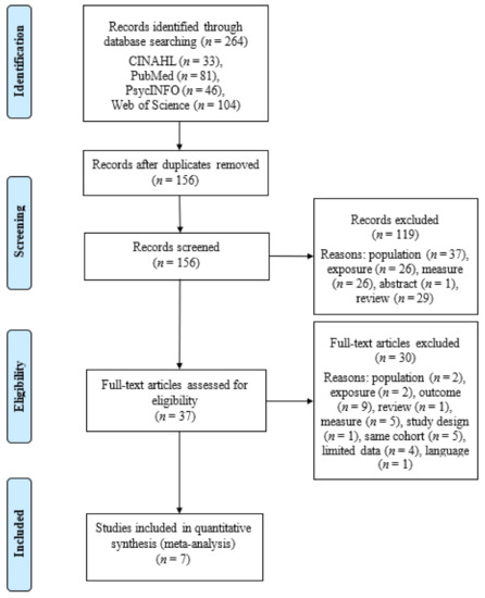 Overall, 264 articles were included in the literature search. After removal of 108 duplicates, 156 articles were available for title, abstract, and full-text screening. Reasons for article exclusion at each stage are shown in Figure 1. Title and abstract review removed 119 articles and after full-text review, 30 articles were further removed. In total, seven studies were left for inclusion in the meta-analysis. The overall agreement after title and abstract selection was 94% and Cohen’s κ (0.85) and 93% (0.81) at the full text retrieval stage.