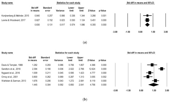 For the environmental control/comparison subgroup, two studies were pooled to include 59 children with POE and 60 non-exposed children. There was a significant positive association of POE with reported subscale scores amongst the environmental control/comparison subgroup (d = 1.02, 95% CI, 0.55–1.49; p < 0.0001), with low heterogeneity (I2 = 33.28), and one poor-quality study [20] (Figure 4).