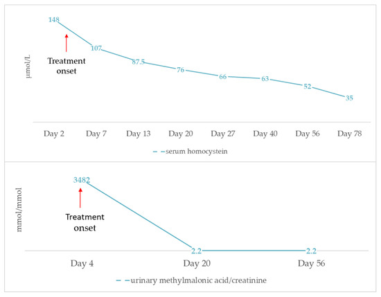Progression of serum homocysteine and urinary methylmalonic acid levels after initiation of treatment with hydroxycobalamin, betain, folic acid and L-carnitine.