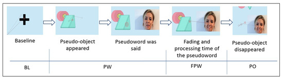 Once the pseudowords were associated with the pseudo-objects, the order in which the task stimuli were shown to the different participants was random. Figure 2 represents the sequence of one of the trials. The first moment of the sequence corresponded to the baseline (BL) register; the second and third ones corresponded to the moment of the presentation of the pseudoword (PW); the fourth moment was the period of time in the fading of the pseudoword (FPW) and the last sequence of the video was when the pseudo-object first, and later the human face, disappeared from the screen (PO).