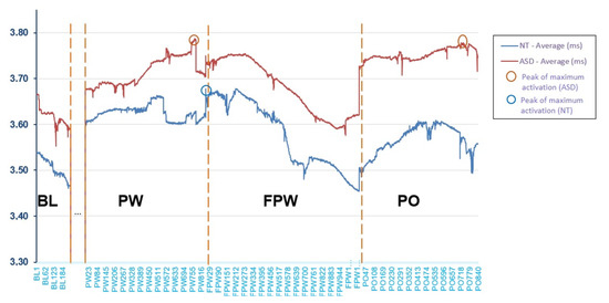 In addition, the NT group’s maximum peak of dilation was found at the end of the processing of the pseudoword, indicating that these children are paying attention and retaining the phonological representation of the pseudoword [30] in working phonological memory, and that they are making a greater cognitive effort at this point. They are ready to learn language and to concentrate their interest on this. In the children with possible ASD, the maximum average value is produced during the disappearance of the pseudo-object (PO), and the maximum peak of dilation occurs at the end of the pseudoword presentation (PW) as in the NT group. However, this also occurs in the period during which the pseudo-object disappears. Two maximum peaks were considered, since the variation between both of them is practically null. These results are not in accordance with what Anderson and Colombo set out in their study [23], since these authors found the maximum peak in the baseline section.