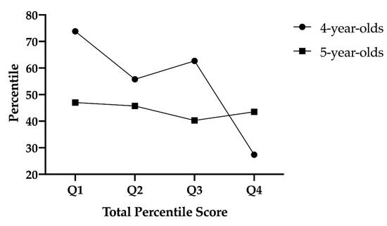 Although there are differences between the percentile reached by preschool children aged 4 and 5 years of age when the quarters are compared (Figure 1), the trend within each age group indicates that there are statistical differences between preschool children born in q1. vs. q2. (Mean = 73.85, SEM = 2.81 vs. Mean = 55.80, SEM = 3.08; (p < 0.001)); q1. vs. q3. [Mean = 73.85, SEM = 2.81 vs. Mean = 62.67, SEM = 3.0; (p = 0.049)] and finally q1. vs. q4. (Mean = 73.85, SEM = 2.81 vs. Mean = 27.40, SEM = 1.01; (p < 0.001)). The same occurs with 5-year-old preschool children but without statistical significance; q1. vs. q2. (Mean = 47.00, SEM = 2.22 vs. Mean = 45.72, SEM = 3.28; (p = 0.742)); q1. vs. q3. (Mean = 47.00, SEM = 2.22 vs. Mean = 40.25, SEM = 5.81; (p = 0.192)) and finally q1. vs. q4. (Mean = 47.00, SEM = 2.22 vs. Mean = 43.50, SEM = 3.30; (p = 0.440)).