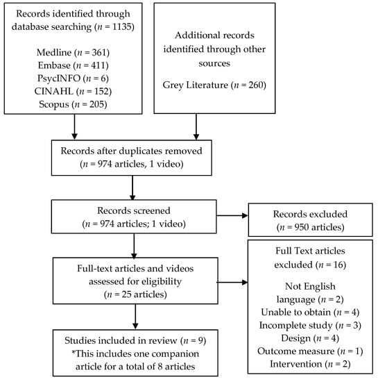 After removing duplicates, 974 articles and 1 video were retrieved and screened for review. Nine articles, representing eight unique studies were ultimately included (Figure 1). As per inclusion criteria, study participants were children and youth 0–18 years of age, undergoing cast removal or cast room procedures (e.g., cast application, pin removal, fracture reduction etc.; Table 1). Study sample sizes ranged from 20–208 participants (median = 85) for a total of 763 participants across the 8 unique studies.