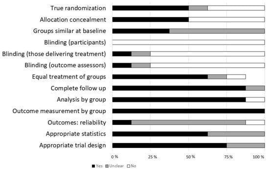 Critical assessment of included studies. Critical appraisal completed using Joanna Briggs Institute critical appraisal tool; checklist for randomized controlled trials []. Color key: black = yes; grey = unsure; white = no.