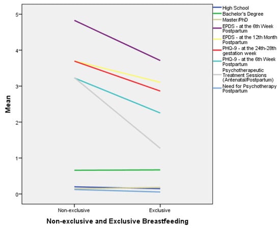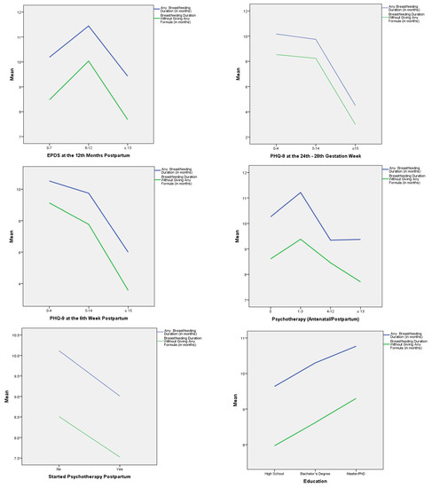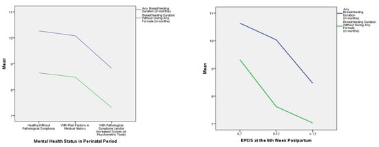 In addition, the multivariate analyses of variance (MANOVA) showed that a shorter any breastfeeding duration seems to be associated with (a) pathological maternal mental health symptoms during the perinatal period (p = 0.029), (b) increased PHQ-9 scores at the 24th–28th gestation week (p = 0.018), (c) increased EPDS scores in the early (at the 6th week) (p = 0.004) and late (at the 12th month) postpartum period (p = 0.031), (d) the initiation of psychotherapy postpartum (p = 0.040), and (e) the number of psychotherapeutic sessions needed (>13 sessions) (p = 0.020). Furthermore, a shorter breastfeeding duration without giving any formula seems to be associated with (a) increased PHQ-9 scores at the 24th–28th gestation week (p = 0.021), (b) increased PHQ-9 scores in the early postpartum period (at the 6th week) (p = 0.002), (c) increased EPDS scores in the late postpartum period (at the 12th month) (p = 0.020), and (d) the mother’s low educational level (p = 0.035). Therefore, this study highlights the importance of woman′s mental health during the perinatal period, considering it a key parameter for the continuation of breastfeeding (exclusive or not).