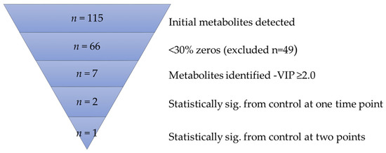We utilized an untargeted LC-MS-based metabolomics approach and therefore did not search for any particular metabolites, but simply sought to identify and test those with a significant correlation to MODS. Multivariate statistical techniques are therefore well suited to an analysis of untargeted metabolomics data. MetaboAnalyst is a web-based platform created and developed by the Wishart group from the University of Alberta, offering R-based software for public use [20,26], and was the software of choice for this analysis.