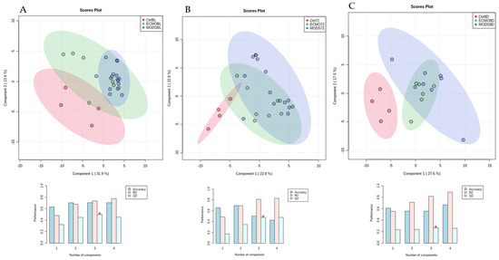 Metabolic profiles for sedation-controls were compared with MODS or ECMO patients, quantified as a percentage of the total. Metabolites with >30% of cases with zero values were excluded from further analysis; consequently, 66 metabolites were analyzed over the 3 time points (Figure 1). In MetaboAnalyst 4.0 [20], data were normalized using pareto scaling (mean-centered and divided by the square root of standard deviation of each variable) and subjected to a multivariate partial least squares-discriminant analysis (PLS-DA) [21], using Q2 values for cross-validation [22]. No data points were excluded. To assess the significance of class discrimination, a permutation test was performed and the PLS-DA model was built (between the data (X) and the permuted class labels (Y)) using the optimal number of components as determined by cross-validation for the model based on the original class assignment [23]. This guided analysis allowed for the display of each specific group assignment. Variable importance in projection (VIP) is a weighted sum of squares of the PLS loadings considering the amount of Y-variation explained in each dimension.