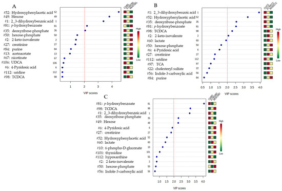 The important features as identifies by the PLS-DA at baseline (Figure 3A), at 72 h (Figure 3B), and at 8 days (Figure 3C) reveal seven metabolites with relative concentrations of the corresponding metabolite in each group under study. In total, seven metabolites of interest emerged over the three time points: tauro-chenodeoxycholic acid (TCDCA) (a conjugated bile acid), hexose-monosaccharide (simple sugar), p-hydroxybenzoate (biocide-antimicrobial agent/tyrosine, tryptophan, phenylalanine metabolite), hydroxyphenylacetic acid (HPLA) (a metabolite of phenylalanine), 2_3-dihydroxybenzoic acid (drug metabolite), 2-keto-isovalerate (cellular intermediate for the synthesis of branched-chain amino acids), and deoxyribose phosphate (a pentose phosphate).