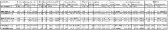 Repeated measures summary statistics for variance of importance (VIP) ≥2.0 at baseline, 72 h and 8 days. Independent t-tests were performed (assuming equal variances). * F-test for equal variances was p ≤ 0.05; Welch’s test (assuming unequal variances) was used; p-values less than 0.008 were deemed significant after Bonferroni adjustment, comparing multi-organ dysfunction syndrome (MODS) and extracorporeal membrane oxygenation (ECMO) samples with sedation-controls. TCDCA: tauro-chenodeoxycholic acid.
