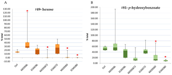 (A) hexose; (B) p-hydroxybenzoate. The top two metabolites with significant differences from sedation-controls over 8 days. Box and whisker plots, which include the median, the interquartile range (box), and the outer range (whiskers), pictorially summarize the central tendency, dispersion, skewness, and extremes of the dataset using a linear scale. MODS: multi-organ dysfunction syndrome; ECMO: extracorporeal membrane oxygenation; BL: baseline; 72: 72-h time point; 8D: 8-day time point. Stars denote statistical significance from independent t-tests or Welch’s test as compared with the sedation-controls.