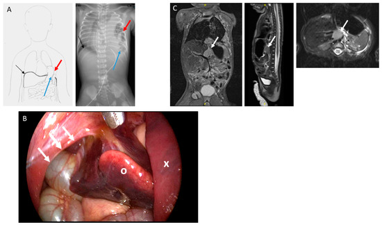 Diagnosis of congenital diaphragmatic hernia (CDH) and neuroblastoma. Intraoperative situs at hernia repair. (A) Anatomical conditions in the patient regarding the congenital diaphragmatic hernia schematically (left panel) and on patient X-ray (right panel). Black arrow—regular right-sided diaphragm; blue arrow—left-sided diaphragmatic defect; red arrow—intrathoracic intestine. (B) The intraoperative situs at time of hernia repair in shown case. The edge of the diaphragm is marked by white arrows, the left lung is indicated by x and the metastatic liver segment reaching through the diaphragmatic defect by O. (C) Magnetic resonance imaging (MRI) shows the neuroblastoma retroperitoneally behind the liver and stomach in front of the abdominal aorta and inferior vena cava (left panel—coronal view; middle panel—sagittal view; right panel—transversal view). Close proximity is given to the liver and the great vessels. In each panel, the primary tumor is indicated by an arrow. MRI was performed after hernia repair.
