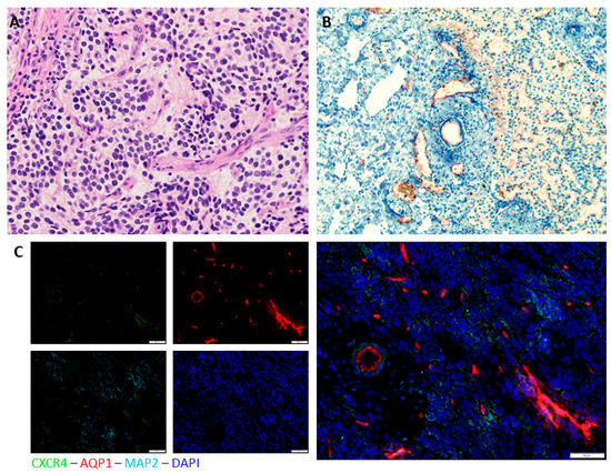 H&E (Hematoxylin and Eosin) and immunohistochemical staining of primary tumor and metastases. (A) H&E staining of primary tumor shows histomorphological characteristics of poorly differentiated, Schwannian stroma poor neuroblastoma; (B) aquaporin 1 (AQP1) immunohistochemical staining and hematoxylin counterstaining of the liver metastases reveals dissolution of the periportal structure in the tumor-infiltrated regions. AQP1 positivity is observed in metastatic areas as well as in vascular endothelium (which can serve as an internal positive control). (C) AQP1, CXCR4 and MAP2 (microtubule associated protein) immunofluorescence staining of the primary tumor. Nuclei staining with DAPI (4′,6-diamidin-2-phenylindol). Next to AQP1, which is expressed in vascular structures as well as specific tumor areas, there is some expression of CXCR4 as a marker for metastatic homing as well as MAP2 expression in some areas indicating a more mature neuronal phenotype. Overall, tumor and metastases express experimental features that can be associated with a more aggressive phenotype.