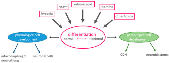 Schematic view of hypothesis: Possible influences on differentiation. The schematic view shows possible influences on physiological differentiation and development, including both possible pro-differentiation influences such as retinoic acid and NMYC as well as anti-differentiation influences such as nitrofen, other toxins and hypoxia. Timing and interaction of the physiologically occurring influences is essential in this developmental process. We hypothesize that a faulty differentiation at a specific time in development or recurring exposure to toxins can lead to the simultaneous occurrence of both CDH (congenital diaphragmatic hernia) and neuroblastoma. They might even arise from the same cause.