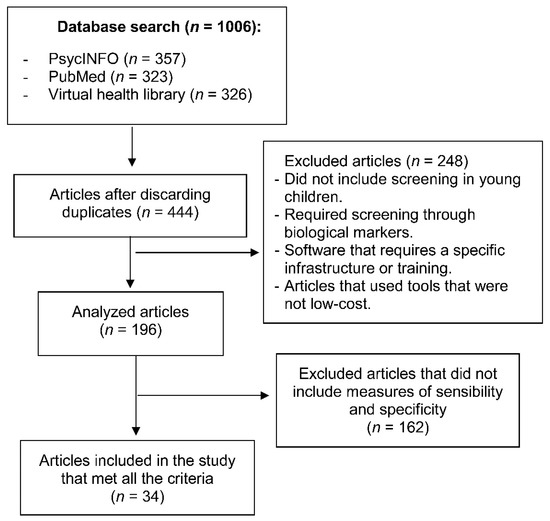 The selection process was carried out by two authors of this review, requiring, in case of doubt, the opinion of the third author. Preferred Reporting Items for Systematic Review and Meta-Analysis (PRISMA) guidelines were applied [8]. In the first selection phase, the title and summary of every article were selected by the established criteria. In this first phase, 248 articles were eliminated because the tools were not low-cost, leaving a total of 196 articles. All the screening tools that appear in these articles were analyzed, removing those that did not present sensitivity and specificity data. This process concluded with a selection of 34 articles that met all previously established criteria.