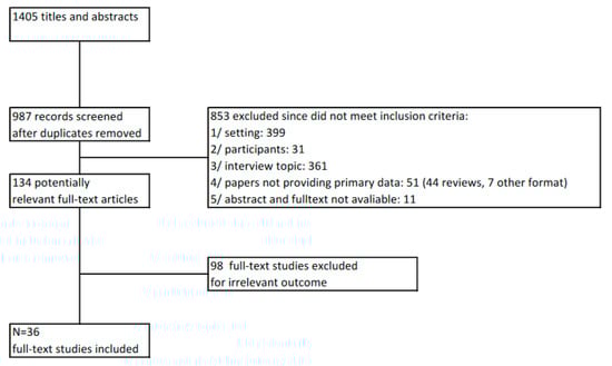 The literature search identified 1405 citations. After removal of duplicates, 987 citations were examined for eligibility by screening the title and abstracts, resulting in 134 papers retrieved in full text. Based on the inclusion criteria, 98 papers were excluded. In total, 36 papers were included for further analysis. This process, including the reasons for exclusion, can be seen in the PRISMA flow diagram (Figure 1).