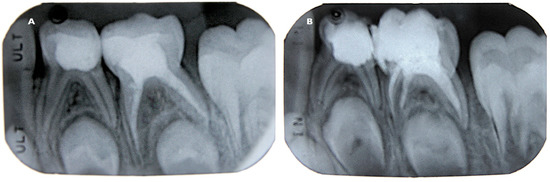 Postoperative radiographs of two mandibular second primary molars after endodontic treatment and coronal restoration (A,B).