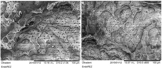 The results of SEM investigations are displayed and visualized in Figure 2 and Figure 3. The observed dentine surfaces demonstrated multiple lacune-like resorptive defects, which are representative of the typical external root resorptions (Figure 2A,B). The numerous wide and less regular dentinal tubules were clearly visible, indicating and reflecting morphological features of dentine of the primary teeth.