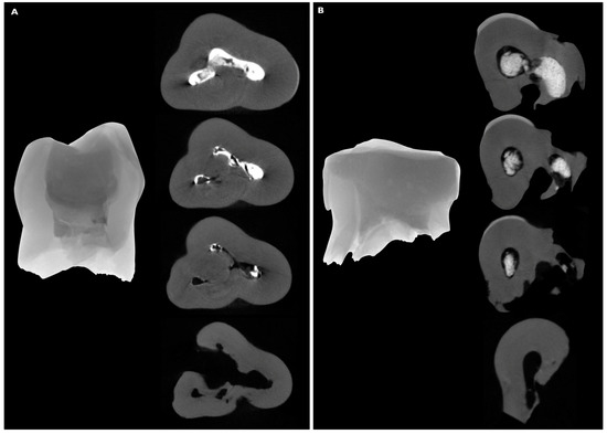The representative images of the two scanned molars (A,B left) and their cross-sectional images (A,B right) at the different levels of the resorbed roots, demonstrating the presence/absence of the ER filler inside the root canal space.
