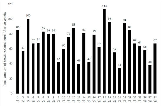 Out of the 28 classes who took part in the intervention, all 28 teachers adopted the intervention to some extent. The median amount of sessions completed over the 10 week period was 76, with 34 being the minimum amount and 113 being the maximum, as displayed in Figure 1.