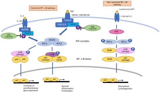 NF-κB signaling pathway and the genes associated with BD-like phenotypes. In the canonical pathway, when signals such as TNF-α and IL-1β are recognized by cytokine receptors, RIPK1 (Receptor-interacting serine/threonine-protein kinase 1) and tumor necrosis factor receptor-associated factor 6 (TRAF6) are ubiquitinated and the IκB kinase (IKK) complex is activated. Activation of the IKK complex leads to IκB phosphorylation and NF-κB (p50/p65) activation. Activated NF-κB is translocated into the nucleus where it activates targeted gene expression. P50 homodimers curb inflammatory reactions. A20 acts on ubiquitination and suppressively regulates this pathway. In particular, upon TNF receptor stimulation, A20 removes K63-linked polyubiquitin chains, thereby preventing the interaction of RIPK1 with NEMO, and subsequently adds K48-linked polyubiquitin chains to RIPK1, targeting it for proteasomal degradation. Furthermore, upon IL-1 receptor binding, A20 removes K63-linked polyubiquitin chains from TRAF6. In the non-canonical pathway, when ligands such as lymphotoxin-β and BAFF (B cell-activating factor belonging to the TNF family) bind to the receptor, NF-κB inducing kinase (NIK) is activated. Phosphorylation of IKK complex by activated NIK leads to p100 (IκB domain) phosphorylation and NF-κB (p52/RelB) activation.