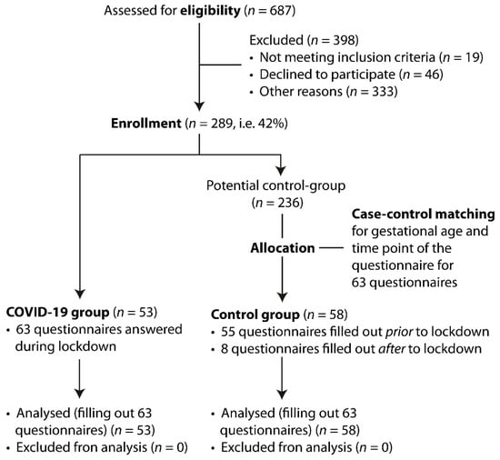 This research project is part of an ongoing single-center prospective study evaluating parental self-efficacy, quality of life, postpartum depressive symptoms and couple relationship in parents of newborn infants at the University Hospital of Zurich since December 2018. During the COVID-19 pandemic the project was allowed to be continued in a restricted way. Consequently, parents were invited to participate, but only if the contact between the physician and parents was needed for clinical reasons. Whenever possible, mother and father were recruited, but it was also possible that one parent participated separately. The analysis took place after the measures that were taken due to COVID-19 pandemic were eased. In this study, we distinguished between strong pandemic measures from 17 March 2020 to 30 May 2020 (lockdown period), characterized by governmental recommendation to stay at home, to work from home, to keep social distancing, and, specific visiting ban at University Hospital of Zurich), and the time before the measures were put in place or after those measures were eased. During the lockdown period 53 parents (43 mothers and 10 fathers) completed 63 questionnaires. These questionnaires were statistically matched by survey point and gestational age of the infant with 63 questionnaires of 58 parents (40 mothers and 18 fathers) that had participated in the study before or after the pandemic measures according to the consort diagram (Figure 1). Mothers and fathers responded to the questionnaires independently and repeatedly at three measuring times: 1) during the first week postpartum, 2) after six weeks postpartum and 3) after three months postpartum. If the baby was born preterm, parents filled in the questionnaire 1) in the first week postpartum, 2) at term equivalent 3) three months postpartum. Some infants were treated in the maternity ward and some were hospitalized at a neonatology unit.