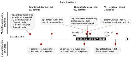 From December 2018 until June 2020, 289 parents of 160 term and 66 preterm children were included in the research project. The response rate was 42%. 63 questionnaires, completed by 53 participants during the lockdown period were statistically matched with 63 questionnaires, completed by 58 participants prior or post the lockdown period (55 questionnaires filled in prior and eight questionnaires filled in after the lockdown period). 36 parents answered one questionnaire during the lockdown period, 10 parents answered two questionnaires during the lock-down period and seven parents answered questionnaires both during and before or after the lockdown period. We had 11 couples participating which means mother and father answered the questionnaires separately. Eight of these couples participated during lockdown period, one couple before lockdown period and of two couples mother and father answered the questionnaire with a time difference of a few days, which caused them to be in both periods (before/after and during lockdown period). Altogether, 64 questionnaires were evaluated for the first point of time of the survey (1 week after birth), 42 questionnaires for the second point of time (at predicted term or 6 weeks after birth) and 20 questionnaires at the third point of time (3 months after birth). During the time before the strong pandemic measures three parents answered more than one questionnaire, during “lockdown” measures ten answered two questionnaires. The characteristics of the study population are shown in Table 1. Timeline of filling in the questionnaires is depicted in Figure 2.